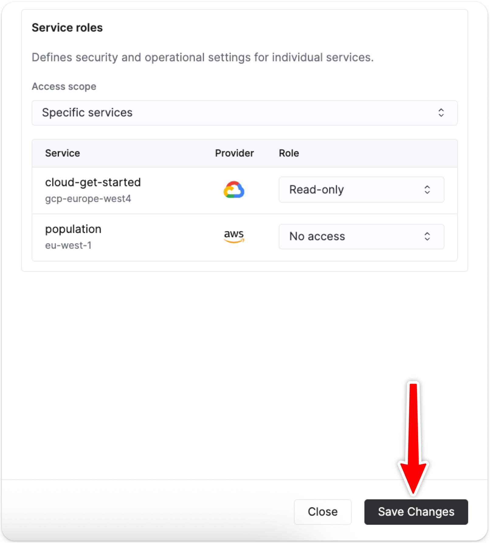 Select the drop-down menu items to adjust the access scope of the service role of the selected user. When selecting Specific services, you can control the role of the user per service.